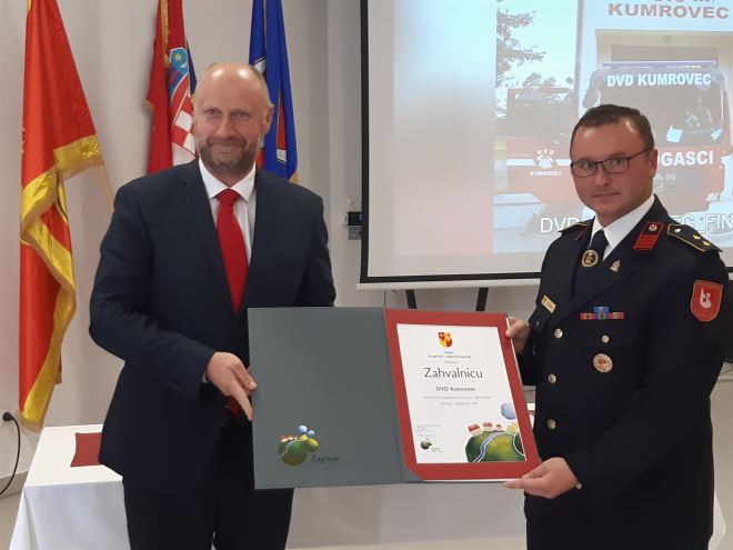Krapinsko-zagorski župan Željko Kolar uručio je kumrovečkom DVD-u Zahvalnicu KZŽ-a: – Vatrogastvo je način života u našoj županiji. Teško je pronaći jednu kuću na području Kumrovca i okolnih naselja iz koje u ovih 70 godina nije potekao barem jedan vatrogasac. Bez obzira je li u pitanju poplava, oluja, snijeg ili požar, vatrogasci su ona snaga na koju se ja kao župan KZŽ uvijek mogu osloniti. Zahvaljujem gospodi Skuliberu i Lovrenčiću jer bez njihove suradnje i politike ulaganja u vatrogastvo ne bi moglo biti rezultata. Promjenom Zakona o 1% obaveznom sufinanciranju lokalne i regionalne samouprave u vatrogastvo puno se toga promijenilo i danas su naša vatrogasna društva puno opremljenija nego što je to prije bio slučaj. No, još uvijek smatram da je entuzijazam i velika ljubav prema vatrogastvu još uvijek na višoj razini nego što smo mi uspjeli s opremljenošću. Pozdravljam program Vlade RH za nabavu novih vatrogasnih vozila, vjerujem da će to doprinijeti da vatrogasna društva još bolje opremimo, jer prije sve trebamo zaštititi vaše živote, jer vi to radite cijelo vrijeme štiteći živote i imovinu drugih ljudi – rekao je župan Kolar.
