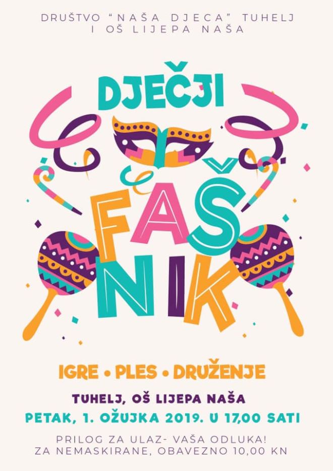Društvo Naša djeca Tuhelj i OŠ Lijepa naša organiziraju dječji fašnik u petak 1. ožujka s početkom u 17 sati u OŠ Lijepa naša Tuhelj. -Očekuju vas igre, ples i druženje - poručuju organizatori. Prilog za ulaz je vaša odluka, a za nemaskirane ono iznosi 10 kuna.