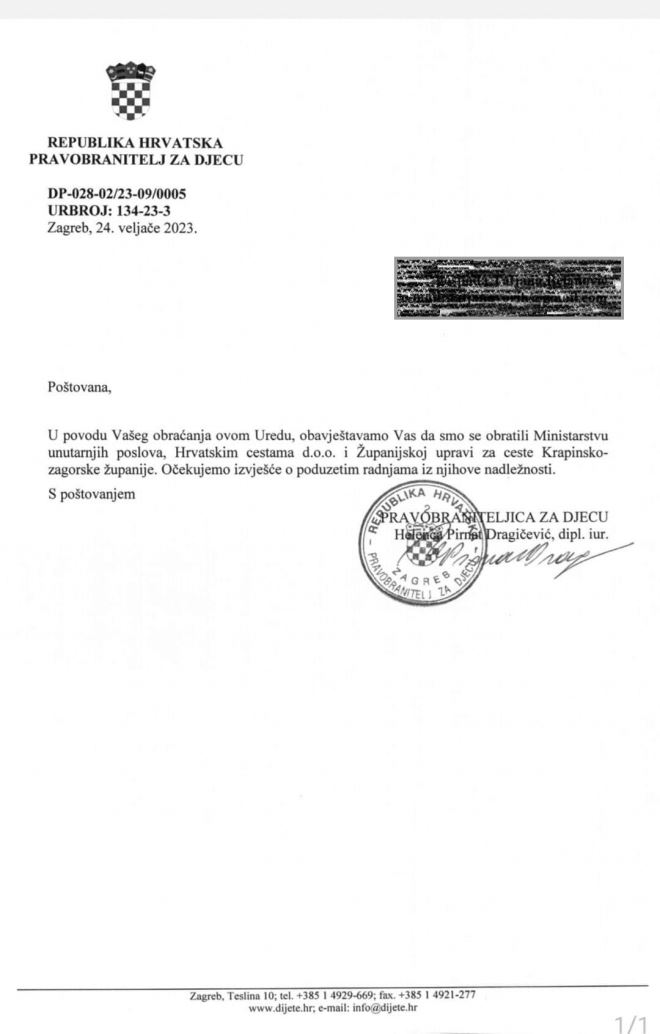 -U povodu Vašeg obraćanja ovom Uredu obavještavamo Vas da smo se obratili Ministarstvu unutarnjih poslova, Hrvatskim cestama d.o.o. i Županijskoj upravi za ceste Krapinsko – zagorske županije. Očekujemo izvješća o poduzetim radnjama iz njihove nadležnosti – stoji u kratkom odgovoru mještanima kojeg je potpisala Helenca Pirnat Dragičević.