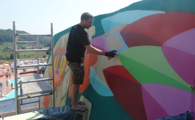 Zanimljivo je što je upravo Lunar autor loga Terma Tuhelj, koji je nastao prije 12 godina kao miks neponovljive zagorske prirode te energije sunca i termalne vode. Zajedno s kolegom iz Meksika oslikao je dva zida duga 25, odnosno 18 metara tijekom najvećih ljetnih vrućina: – S obzirom da je zid specifičan po svojoj dužini, nastojali smo naći poveznicu između mojeg i Faridovog rada, tvoreći jednu smislenu cjelinu. Farid je došao sa svojom idejom, koju smo dalje zajedno dorađivali tako da smo specifični meksički kolorit prilagodili ovoj sredini. Željeli smo napraviti nešto novo i osvježavajuće – rekao je Slaven Kosanović Lunar.