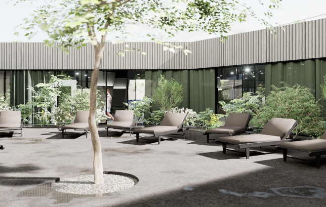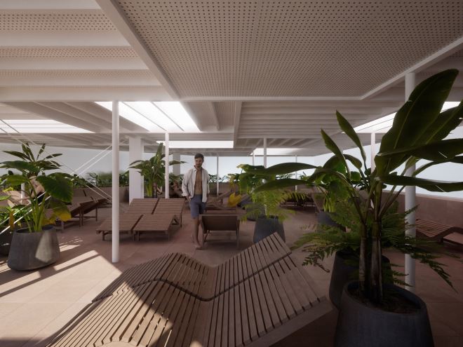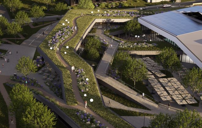 - novog trga sa zelenim krovovima, šetnicama i fontanom te recepcijom kupališta za vanjske posjetitelje,