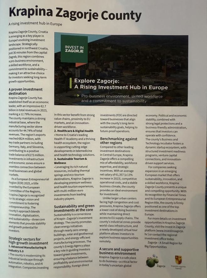 Zagorje je prepoznato zahvaljujući svojim snažnim mjerama za poticanje poduzetništva, programima potpora, ulaganjima u poslovne zone te strateškom pozicioniranju na tržištu investicija. Ovo priznanje dolazi u trenutku kada globalni trendovi upućuju na sve veću važnost održivih i inovativnih investicijskih modela.