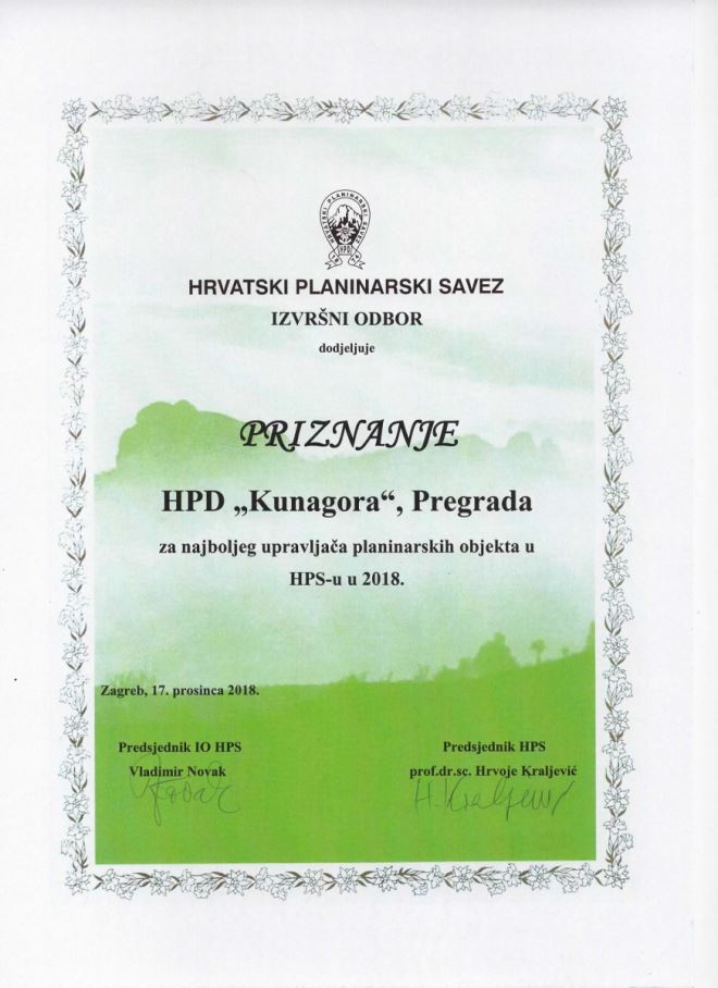 U kategoriji „Najbolji upravljač planinarskih objekata HPS-a u 2018.“, za izuzetnu brigu i upravljanje planinarskom kućom na Kunagori, proglašeno je planinarsko društvo HPD Kunagora Pregrada
