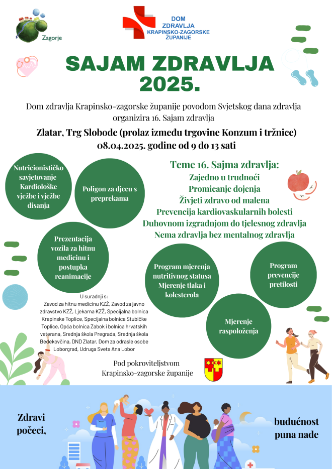 Dom zdravlja Krapinsko-zagorske županije povodom Svjetskog dana zdravlja organizira tradicionalni Sajam zdravlja koji će se održati u utorak, 08.04.2025. na Trgu slobode u Zlataru.