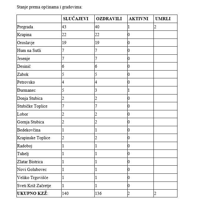 U nastavku je tablica sa statističkim podacima prema jedinicama lokalne samouprave: o broju stanovnika Krapinsko-zagorske županije koji su bili evidentirani kao zaraženi koronavirusom, podatke o broju stanovnika Krapinsko-zagorske županije koji su evidentirani kao ozdravljeni, podatke o broju preminulih te broju aktivnih slučajeva. U statistiku kontinuirano uključujemo i stanovnike Krapinsko-zagorske županije testirane izvan područja naše županije te osobe koje nisu imale pozitivan nalaz na koronavirus, no sukladno uputama, se zbog epidemiološke anmneze i kliničke slike vode kao pozitivne.