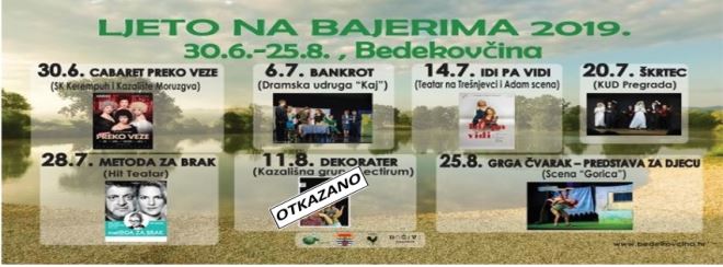 - Sa žaljenjem obavještavamo cijenjenu publiku da je predstava "Dekorater" koja je trebala igrati u nedjelju, 11. kolovoza, u sklopu manifestacije "Ljeto na Bajerima" otkazana. Sljedeća predstava koja će se odigrati u sklopu manifestacije je predstava za djecu "Grga Čvarak" - poručili su iz Općine Bedekovčina.