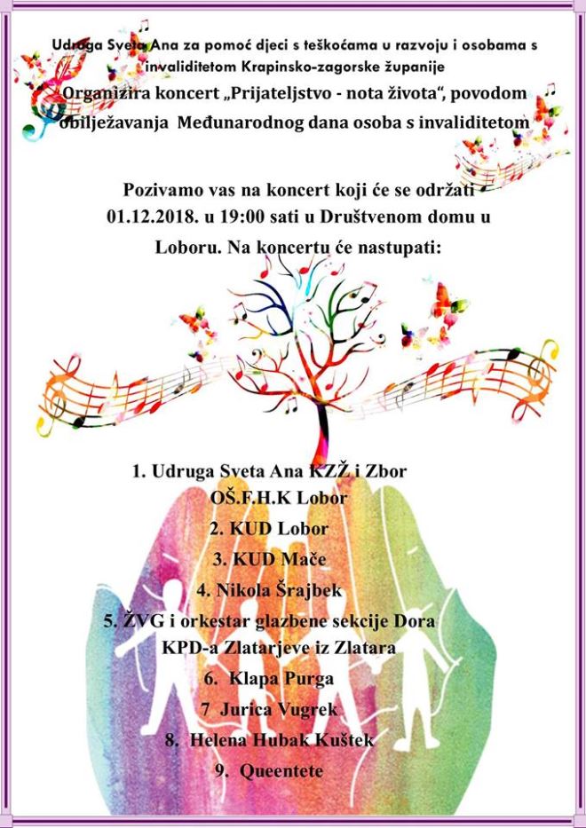 Povodom obilježavanja Međunarodnog dana osoba s invaliditetom Sveta Ana, udruga za pomoć djeci s teškoćama u razvoju i osobama s invaliditetom Krapinsko – zagorske županije organizira koncert "Prijateljstvo - nota života" . Koncert koji će se održati u subotu, 1. prosinca u 19 sati u Društvenom domu u Loboru. Nastupit će Udruga Sveta Ana KZŽ i Zbor, OŠ Franje Horvata Kiša, KUD Lobor, KUD Mače, Nikola Šrajbek, ŽVG i Orkestar glazbene sekcije Dora, KPD Zlatarjeve iz Zlatara, Klapa Purga, Jurica Vugrek, Helena Hubak Kuštek i Queentete.