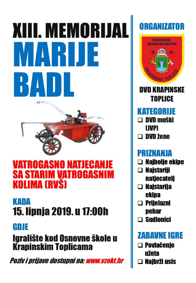 U organizaciji DVD-a Krapinske Toplice u subotu 15. lipnja kod Osnovne škole Krapinske Toplice s početkom u 17 sati održat će se XIII. Memorijal Marije Badl, vatrogasno natjecanje sa starim vatrogasnim kolima (RVŠ). Takvo staro vatrogasno vozilo u Hrvatskoj ima DVD Krapinske Toplice i u Međimurju. Natječu se muški i ženski DVD-ovi, a priznanja će primiti najbolja ekipa, najstariji natjecatelj, najstarija ekipa, prijelazni pehar. Očekuju vas i zabavne igre i to povlačenje užeta i najbrži usis.