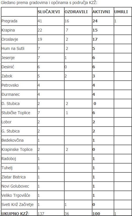 U protekla 24 sata nema novozaraženih na području Krapinsko-zagorske županije. U subotu, 25. travnja, u 8:30 sati zaprimljeni su negativni nalazi za 63 od 68 uzetih briseva u petak, 24. travnja 2020. godine. Također je zaprimljen negativan rezultat brisa koji se čekao još od 23. travnja. Još uvijek se čekaju rezultati 5 nalaza. Ukupno je uzeto 1.330 uzoraka. U ovom trenutku evidentirano je 100 aktivnih slučajeva zaraze stanovnika Krapinsko-zagorske županije koronavirusom.