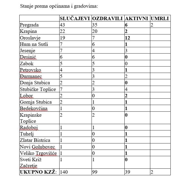 U prilogu se nalazi tablica sa statističkim podacima prema jedinicama lokalne samouprave: o broju stanovnika Krapinsko-zagorske županije koji su bili evidentirani kao zaraženi koronavirusom, podatke o broju stanovnika Krapinsko-zagorske županije koji su evidentirani kao ozdravljeni, podatke o broju preminulih te broju aktivnih slučajeva. U statistiku kontinuirano uključujemo i stanovnike Krapinsko-zagorske županije testirane izvan područja naše županije te osobe koje nisu imale pozitivan nalaz na koronavirus, no sukladno uputama, se zbog epidemiološke anmneze i kliničke slike vode kao pozitivne.