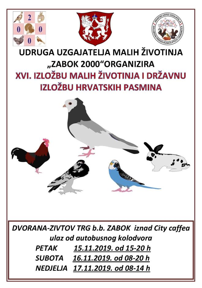 Udruga uzgajtelja malih životinja 'Zabok 2000' organizira izložbu malih životinja i državnu izložbu hrvatskih pasmina u Zaboku. Izlagat će 107 izlagača iz 12 županija te će se moći vidjeti 880 eksponata, od čega je 427 pasmina. Životinje će se moći razgledati u dvorani iznad City caffea (ulaz kod trgovine MANA) u petak 15.11. od 15 do 20 sati, u subotu 16. 11. od 8 do 20 sati te u nedjelju 17. studenog od 8 do 14 sati.