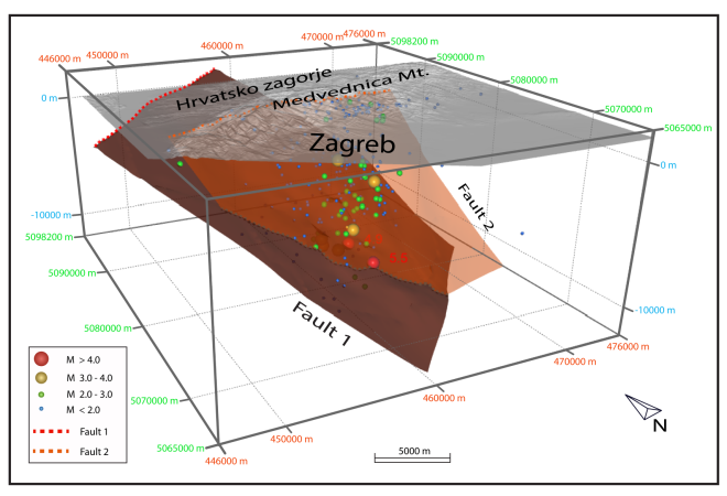 - Preliminarni 3D model Zagrebačke potresne sekvence iz ožujka i travnja o.g. Rasjed 1 je interpretiran kao primarni rasjed, a rasjed 2 kao sekundarni (Geosciences 2020, 10, 252; doi10.3390geosciences10070252)