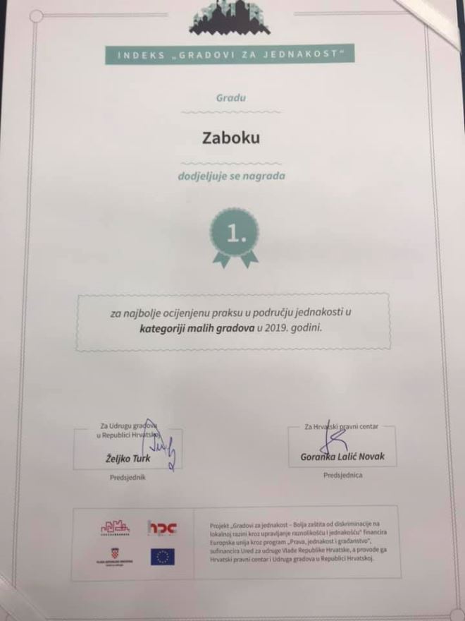 Grad Zabok dobitnik je 1. nagrade u kategoriji malih gradova u sklopu projekta 'Gradovi za jednakost' u organizaciji Hrvatskog pravnog centra i Udruge gradova u Republici Hrvatskoj, uz potporu Odbora za lokalnu i područnu (regionalnu) samoupravu. Nagradu su preuzeli i na događanju prisustvovali gradonačelnik Ivan Hanžek i njegova zamjenica Valentina Đurek.