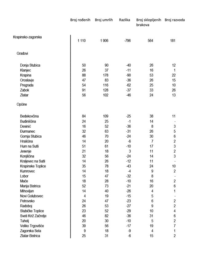 Kada je u pitanju statistika po gradovima u 2018. godini najveći broj rođenih ima Zabok i to 91, no umrlo je 128 ljudi pa to dovodi do negativnog prirasta od -37. Najviše umrlih je u Krapini i to 178 dok je rođeno 88 djece pa je prirast od svih jedinica lokalne samouprave najveći upravo u glavnom gradu naše županije i iznosi -90. Među općinama i najviše rođenih i najviše umrlih u 2018. godini ima Bedekovčina. Tamo je rođeno 84 djece, a umrlo je 109 ljudi. Najmanje je djece rođeno u Novom Golubovcu, njih četvero, a najmanje u stanovnika umrlo u Kumrovcu i Jesenju, njih po 18. Jedina jedinica lokalne samouprave u našoj županiji koja bilježi pozitivan prirodni prirast je Jesenje. Tamo je rođeno 21 dijete, a umrlo je 18 ljudi. Ako se pogledaju brojke o sklopljenim brakovima po gradovima i općinama, najviše se brakova u 2018. godini sklopilo u Krapini, njih 53, a najviše je razvoda zabilježeno u Zaboku, njih 26. Nijedan razvod nije zabilježen u Budinšćini, Kraljevcu na Sutli, Loboru i Novom Golubovcu.