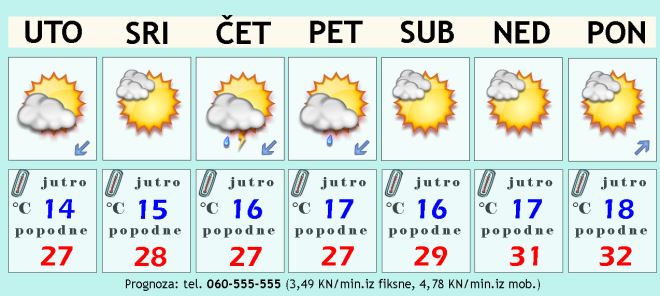 U utorak izgleda djelomično sunčano i većinom suho. Čini se da će puhati slab do umjeren sjeveroistočni vjetar pa i dalje nema nekog značajnijeg zatopljenja, ostat će vrlo ugodno. Najniža jutarnja temperatura oko 14, a dnevna temperatura trebala bi ostati između 26 i 28 Celzijevih stupnjeva uz dobru bioprognozu.