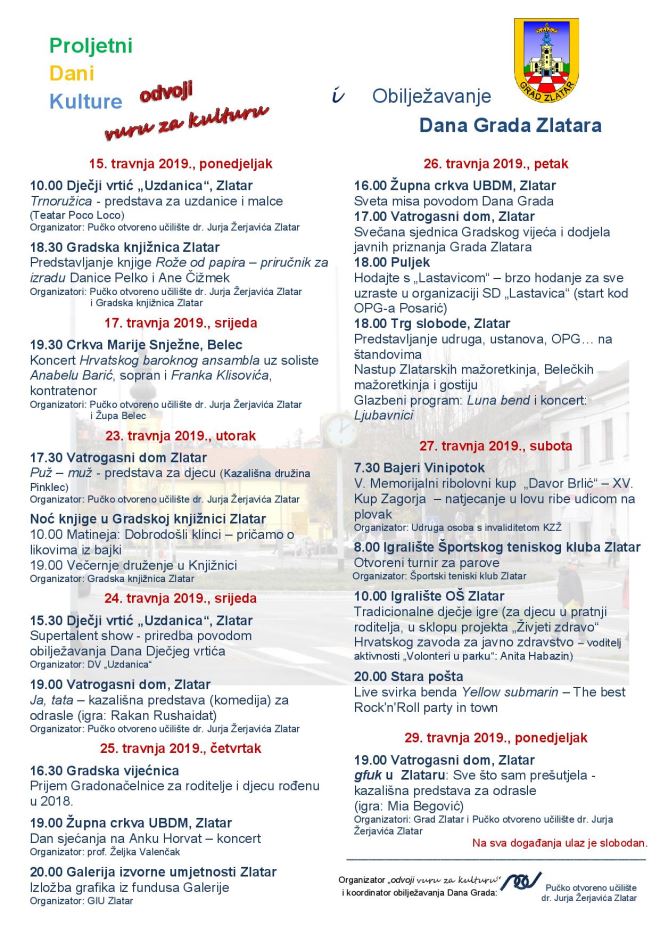 U organizaciji Grada Zlatara i POU dr. Jurja Žerjavića traju Proljetni dani kulture – 'Odvoji vuru za kulturu', sadržaji upriličeni povodom Dana grada Zlatara koji se obilježava 27. travnja.