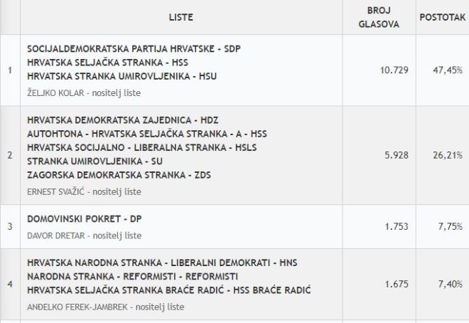 Kandidat HDZ, A - HSS, HSLS, SU, ZDS Ernest Svažić dobio je 5.120 glasova odnosno 22,24%, Davor Dretar Drele, kandidat Domivinskog pokreta dobio je 9,14 posto glasova izašliš birača, i Anđelko Ferek Jambrek, kandidat HNS, REeformista i HSS Braće Radić 8,55 posto.