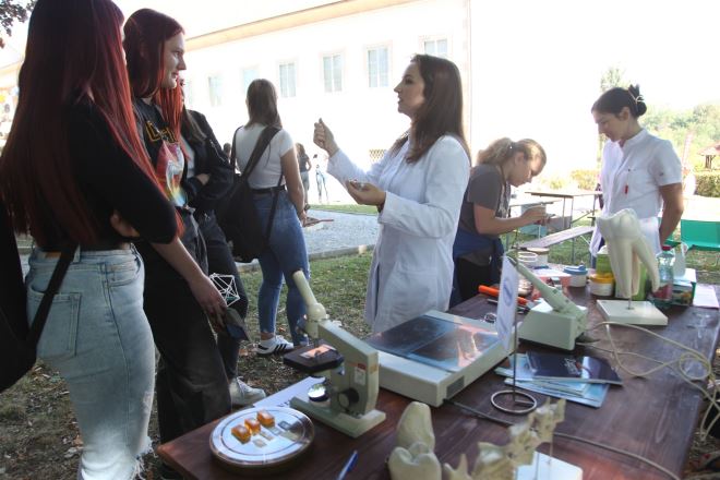 Jedan od izlagača bio je i Stomatološki fakultet u Zagrebu. Buduće stomatologinje na svom su štandu predstavile fakultet, ali i struku kojom se kane baviti. – Danas to ovdje predstavljamo kroz tri znanosti, biologiju, fiziku i kemiju, jer su sve te tri znanosti one koje se koriste u struci i našem daljem studiranju. Od biologije predstavljamo modele i presjeke zuba, a mikroskopski možete vidjeti i karijese, te imamo i rendgenske snimke zuba. u onom dijelu fizike pričamo o polimerizaciji svjetlom i načinu na koji stomatolog radi ispun u ustima pacijentu, dok u dijelu kemije govorimo o procesima kojima dobivamo radni model za izradu bilo protetskih nadomjestaka ili neke terapije – ispričala nam je Izidora Pavetić iz Zlatar Bistrice, studentica 4. godine Stomatološkog fakulteta u Zagrebu te je dodala kako je odaziv odličan, posjetitelje itekako zanima ta struka te su se mnogo raspitivali o samom razvoju mliječnih i trajnih zuba, liječenju zuba i samoj našoj struci i poslu.