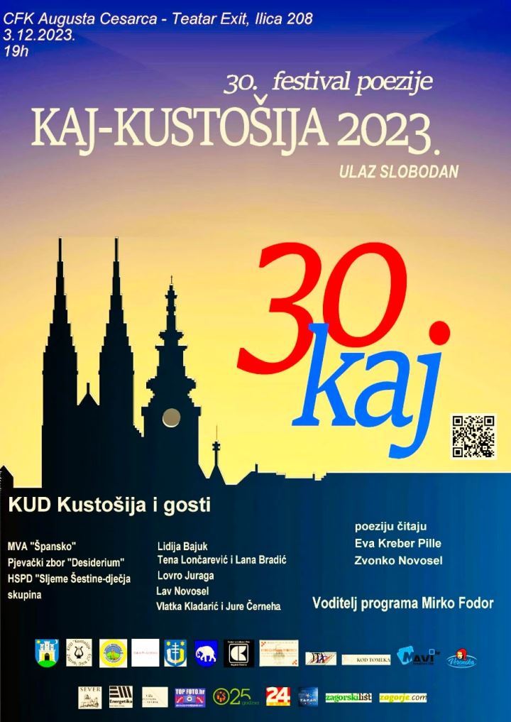 U nedjelju, 3. prosinca s početkom u 19 sati u Centru a kulturu i film A. Cesarca (Teatar Exit), u Ilici 209 održat će se JUBILARNI, 30. FESTIVAL KAJKAVSKE POEZIJE KAJ-KUSTOŠIJA 2023.