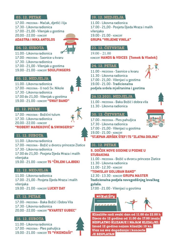-Program, odnosno koncerti i animacije za djecu, odvijat će se tijekom petka, subote i nedjelje. Osim koncerata, bit će tu i predstave i radionice za djecu, a posjetit će ih i Sveti Nikola i Djed Božićnjak. Advent možete posjetiti i radnim danima, kada je klizalište otvoreno, kao i ugostiteljska ponuda, uz božićnu glazbu i toplu atmosferu, a za sva druga iznenađenja pratite nas na Fejsu ili Instagramu – najavljuje organizator.