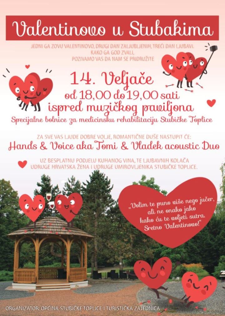 Za sve vas ljude dobre volje, romantične duše nastupit će Hands & Voice aka Tomi & Vladek acoustic Duo, a tu je i besplatna podjela kuhanog vina, te ljubavnih kolača Udruge Hrvatska žena i Udruge umirovljenika Stubičke Toplice.