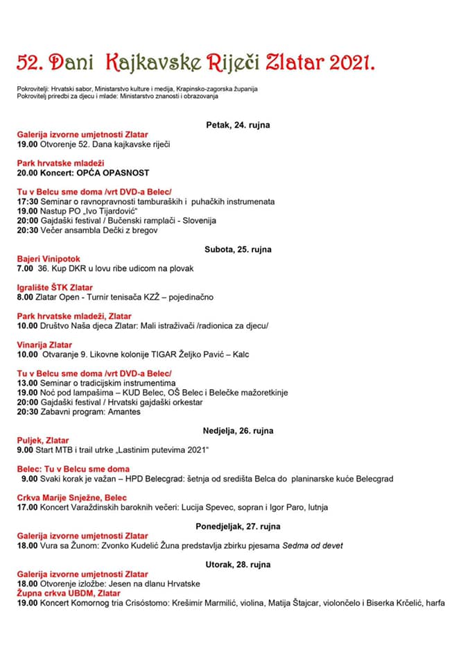 U petak 24. rujna započinju 52. Dani kajkavske riječi otvorenjem u Galeriji izvorne umjetnosti u Zlataru, nakon čega slijedi koncert Opće opasnosti u Parku hrvatske mladeži. Program traje do nedjelje 3. listopada, a donosi razna zabavna, kulturna i sportska događanja.