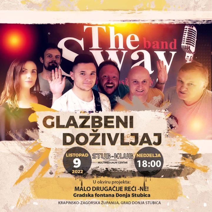 U nedjelju 9. listopada održati će se četvrti koncert u okviru projekta Malo drugačije reći - NE! koji provodi Multimedijalni centar STUB-KLUB. Na koncertu će nastupiti The Sway - zagorski pop rock cover bend koji izvode domaće i strane glazbene hitove koje "baš i ne sviraju svi i druge glazbene grupe". Koncert će se održati kod Fontane prijateljstva u Donjoj Stubici od 18 h, a dobrodošle su sve generacije građana.