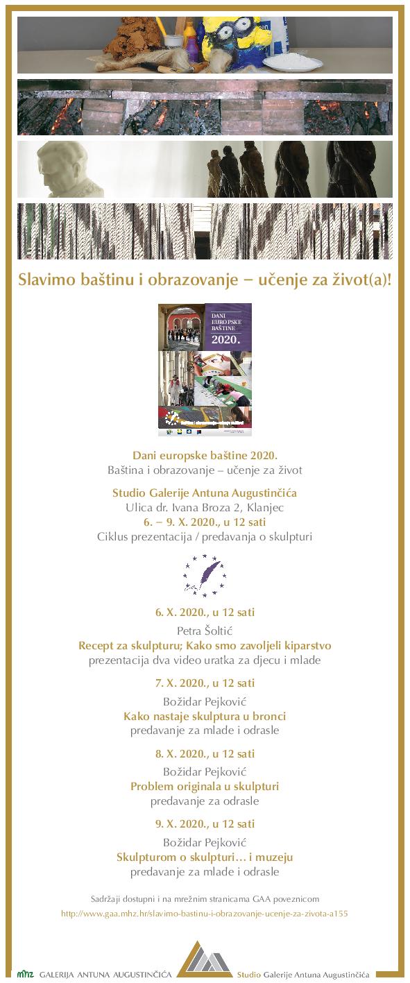Povodom Dana europske baštine 2020. s temom Baština i obrazovanje - učenje za život, u Studiju Galerije Antuna Augustinčića u Klanjcu (Ulica dr. Ivana Broza 2) od 6. do 9. listopada 2020. godine održat će se ciklus prezentacija/predavanja o skulpturi: