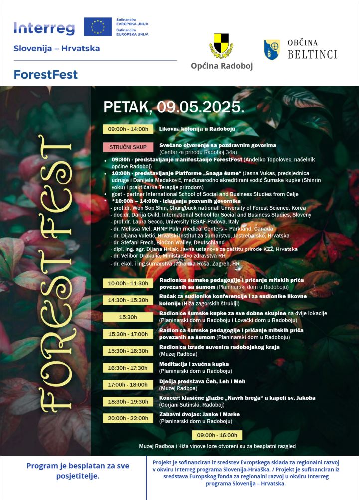 Od 9. do 11 .svibnja u Radoboju će se po drugi put održati ForestFest Radoboj u organizaciji Općine Radoboj i platforme Snaga šume / Forest Power. ForestFest je jedinstvena manifestacija posvećena prirodi i boravku u prirodi, zdravim načinom života, brizi o okolišu, održivom turizmu, suradnji te druženju i zajedništvu. Ovaj događaj prepoznat je i na međunarodnoj razini. U suradnji Općine Radoboj s Općinom Beltinci iz Pomurske regije (SLO), manifestacija je ujedno i bilateralno tematsko festivalsko događanje šumske terapije, usmjereno na unapređenje prekogranične suradnje. Projekt je sufinanciran sredstvima Europskog fonda za regionalni razvoj u okviru Interreg programa Slovenija – Hrvatska.