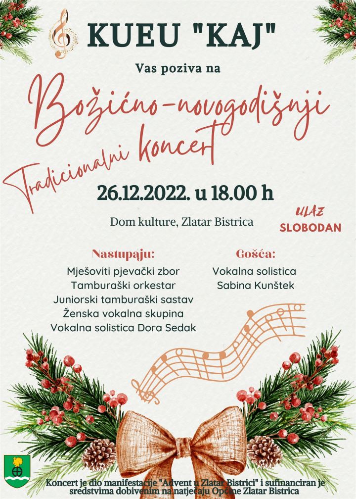 KUEU Kaj iz Zlatar Bistrice poziva vas na tradicionalni božićni koncert koji će se održati na Štefanje, 26. prosinca u 18 sati u zlatarbistričkom domu kulture. Sudjelovat će tamburaški juniorski sastav, tamburaški orkestar, mješoviti pjevački zbor i ženska vokalna skupina te gošća. Sabina Kunštek, vokalna solistica.