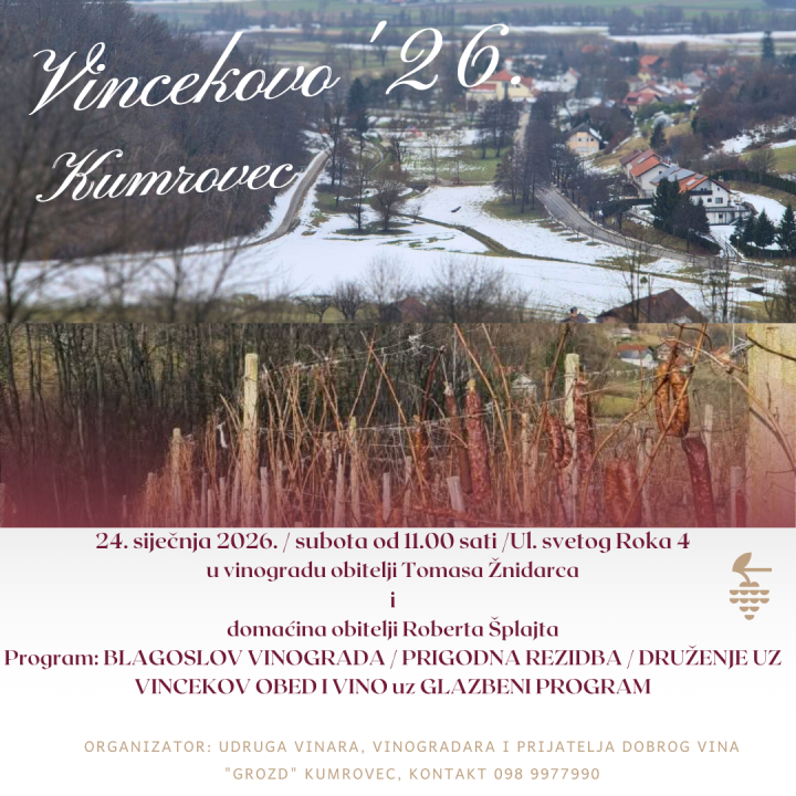Uz blagoslov vinograda i prigodnu rezidbu očekuje vas druženje uz Vincekov obed i vino te glazbeni program. Dođite u Ulicu sv. Roka 4, Kumrovec, od 11 sati.