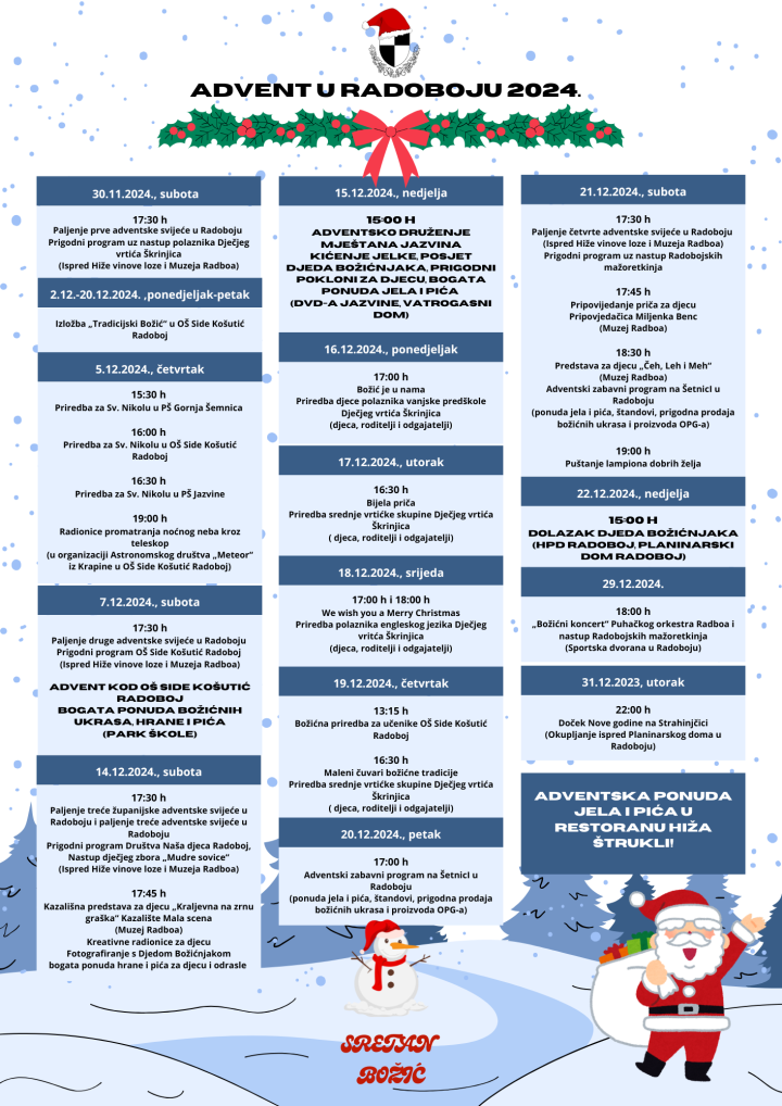 Mnoštvo adventskih događanja biti će zaokruženo 29. prosinca "Božićnim koncertom" Puhačkog orkestra Radboa i nastupom Radobojskih mažoretkinja.