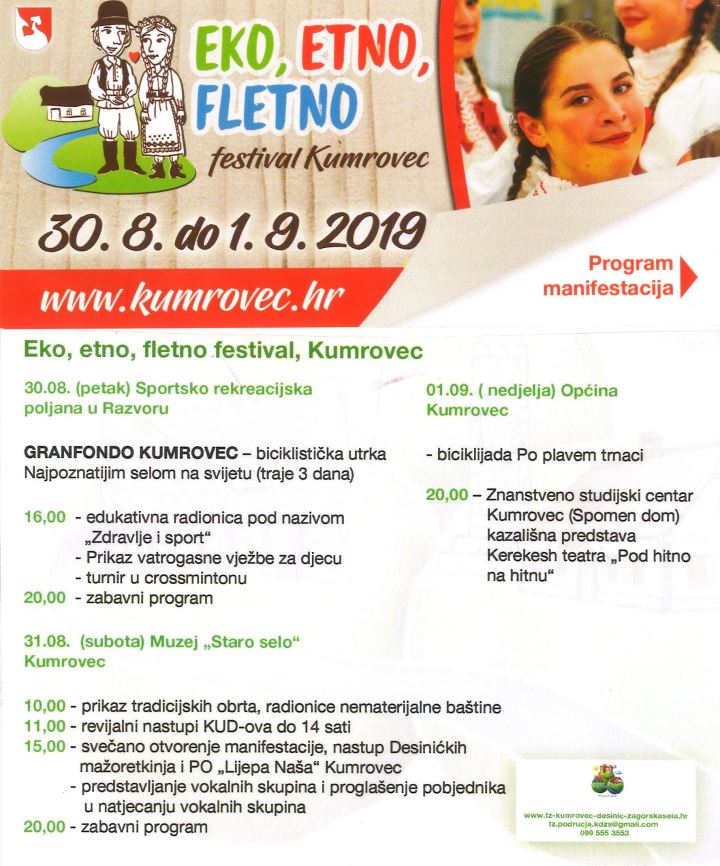 U razdoblju od 30. kolovoza do 1. rujna će se u Kumrovcu održati manifestacija 'Eko, etno, fletno festival Kumrovec' .