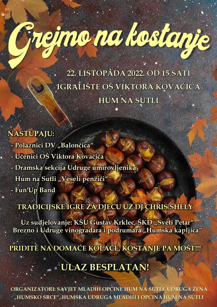 U subotu, 22. listopada 2022. godine će se na igralištu OŠ Viktora Kovačića u Humu na Sutli održati manifestacija „Grejmo na kostanje“ koju organiziraju Savjet mladih Općine Hum na Sutli, Udruga žena „Humsko srce“, Humska Udruga Mladih i Općina Hum na Sutli. U prigodnom kulturno-umjetničkom programu nastupit će polaznici Dječjeg vrtića „Balončica“, učenici OŠ Viktora Kovačića i Dramska sekcija Udruge umirovljenika Hum na Sutli „Veseli penzići“. Nakon prigodnog programa slijedi zabava uz Fun' Up Band. Najmlađi će se moći okušati u tradicijskim igrama pri čemu će ih zabavljati DJ CHRIS SHELY.