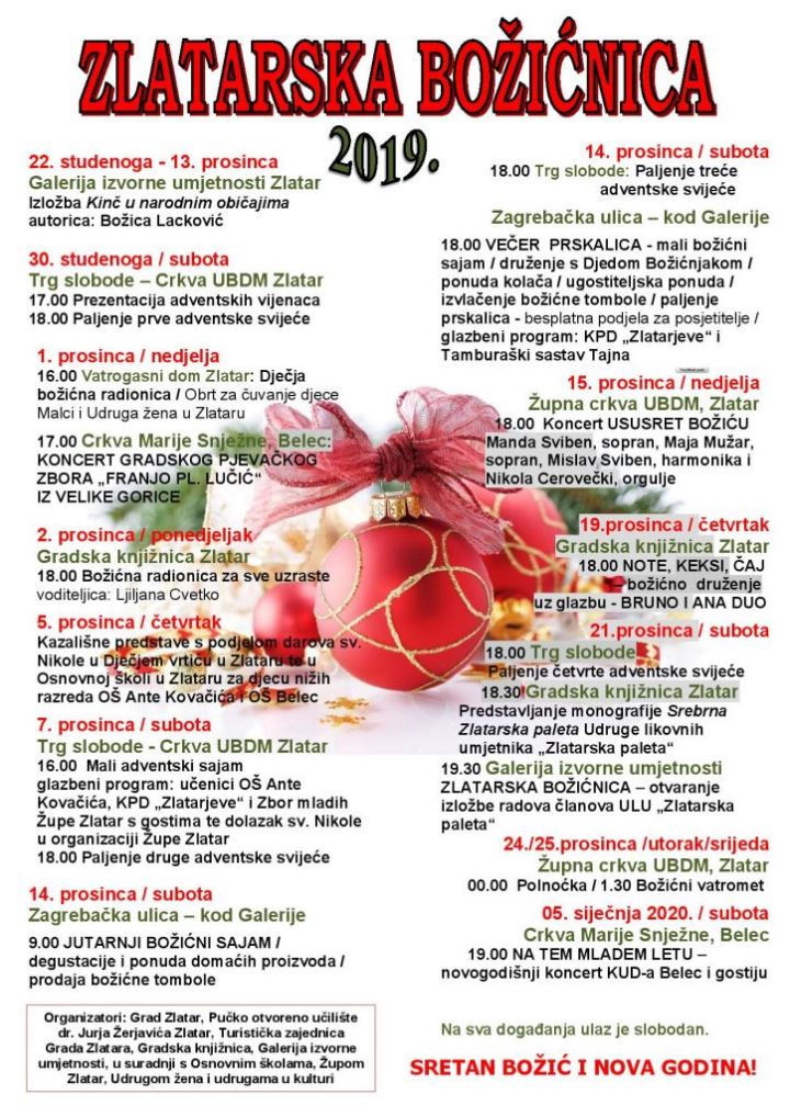 Grad Zlatar, POU dr. Jurja Žerjavića Zlatar, TZ Grada Zlatara, Gradska knjižnica, Galerija izvorne umjetnosti u suradnji s osnovnim školama, Župom Zlatar, Udrugom žena i udrugama u kulturi i ove godine organiziraju tradicionalnu Zlatarsku božićnicu. Manifestacija je započela otvorenjem izložbe 'Kinč u narodnim običajima', a nastavlja se u subotu 30. studenog na Trgu slobode i Crkvi UBDM Zlatar. U 17 sati bit će prezentacija adventskih vijenaca, a u 18 sati paljenje prve adventske svijeće. U nedjelju 1. prosinca u Vatrogasnom domu u Zlataru održat će se dječja božićna radionica u 16 sati, a u 17 sati u župnoj crkvi koncert će održati gradski pjevači zbor 'Franjo pl. Lučić' iz Velike Gorice. U ponedjeljak 2. prosinca u Gradskoj knjižnici u 18 sati održat će se Božićna radionica za sve uzraste, pod vodstvom Ljiljane Cvetko.