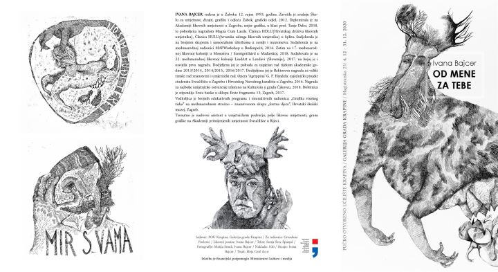 U Galeriji grada Krapine u petak 4. prosinca 2020. u 18,00 sati u Galeriji grada Krapine uz sve propisane epidemiološke mjere otvorit će se izložba grafika „Od mene za tebe“ krapinčanke, grafičarke Ivane Bajcer. Otvorenje će se moći pratiti i putem YouTube kanala Pučkog otvorenog učilišta Krapina.