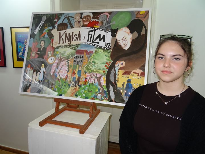 Govoreći pred okupljenim učiteljima, učenicima i njihovim roditeljima zahvalio je sadašnjoj učiteljici likovne kulture, Maji Burek, „koja se brine o tome da razredno ozračje u nastavi likovne kulture bude ugodno i opušteno, a svojim zamislima i vlastitom kreativnošću učenicima nudi brojne aktivnosti i kreativne tehnike, često prilagođene digitalnome dobu u kojemu živimo, kako bi oni u svoj punini mogli izraziti svoj kreativni potencijal“. Na izložbi, koja je otvorena do potkraj kolovoza, izloženi su radovi učenika nižih razreda i predmetne nastave, a pozornost privlači likovno djelo „Knjiga i film“ Vjere Posarić, učenice sedmoga razreda.