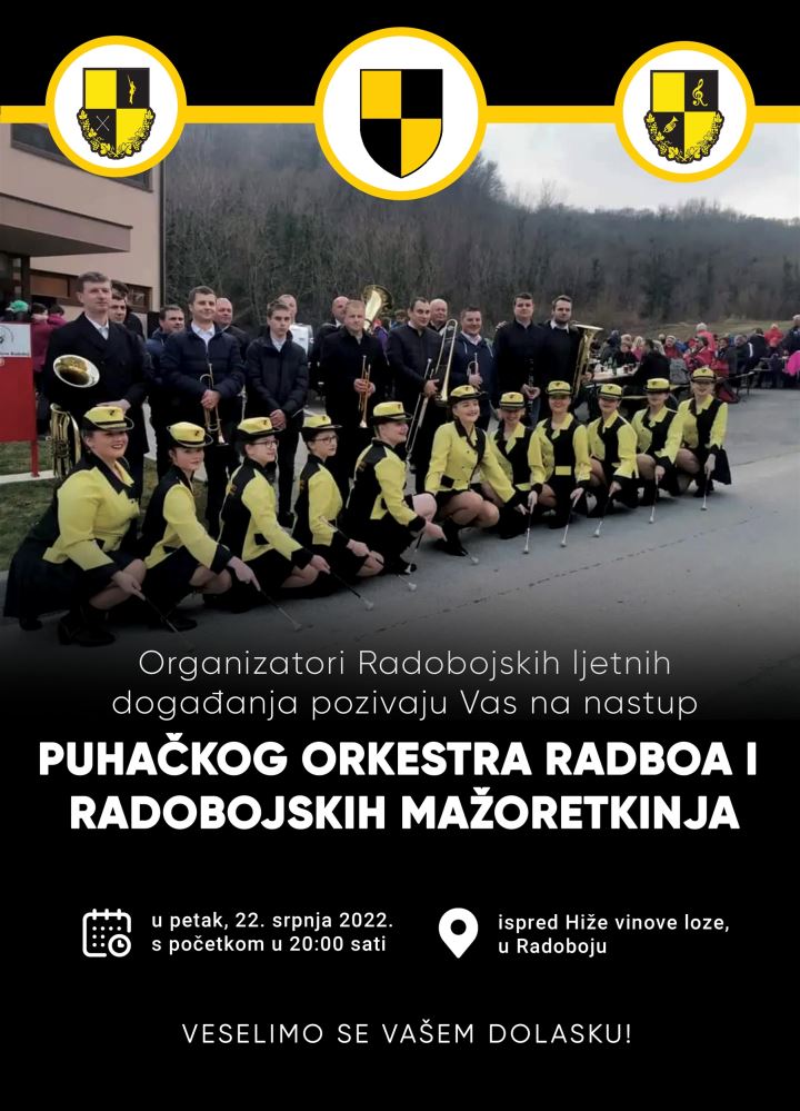 Sutra, u petak, s početkom u 20 sati ispred Hiže vinove loze održat će se nastup Puhačkog orkestra Radboa i Radobojskih mažoretkinja.