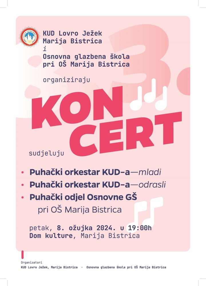 U petak 8. ožujka u Domu kulture u Mariji Bistrici održat će se zanimljivi koncert, kao plod nove suradnje između KUD-a ''Lovro Ježek'' Marija Bistrica i Osnovne glazbene škole pri OŠ Marija Bistrica. Na koncertu će nastupiti Puhački orkestar KUD-a ''Lovro Ježek'' - mladi i stariji i Puhački odjel Osnovne glazbene škole pri OŠ Marija Bistrica. Početak koncerta je u 19 sati, a ulaz je slobodan.