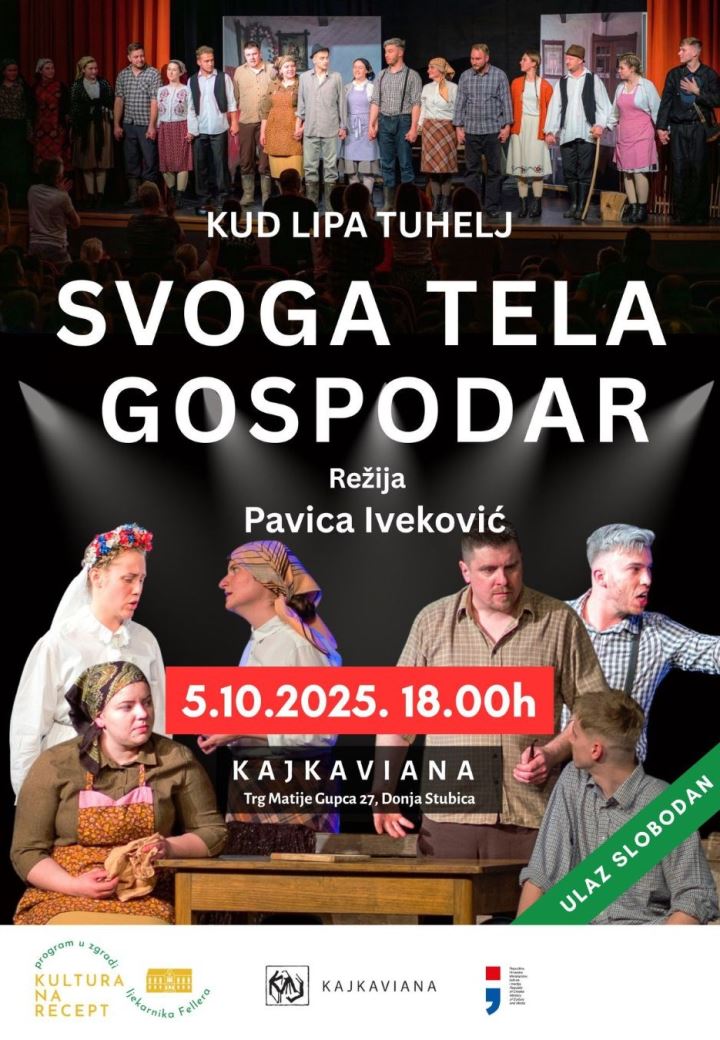 U nedjelju, 5. listopada 2025. s početkom u 18 sati, Kajkaviana će postati kazališna pozornica. Naime, dramska sekcija KUD-a Naša lipa Tuhelj izvest će predstavu “Svoga tela gospodar” pod redateljskom palicom Pavice Iveković.
