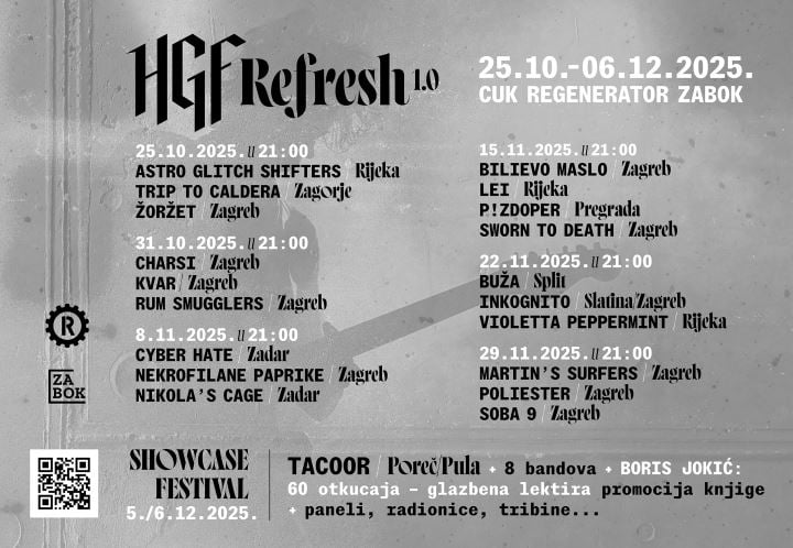 Za razliku od prijašnjih natjecateljskih izdanja, HGF Refresh donosi revijalne večeri na kojima će se svaki vikend predstaviti po tri benda, dok će vrhunac događanja biti završni Showcase festival 5. i 6. prosinca. Dodatnu vrijednost festivalskom programu donose i tematske DISKO večeri, koje će se održavati nakon koncertnog dijela programa. U prostoru kluba publiku će zabavljati poznati DJ-evi uz raznoliku selekciju glazbenih hitova, čime CUK Regenerator želi dodatno obogatiti festivalske vikende i samim time oplemeniti kulturnu i noćnu ponudu Zaboka. Prva DISKO večer održat će se 31. listopada, u Halloween izdanju, a za najbolje maske pripremljene su i nagrade.)