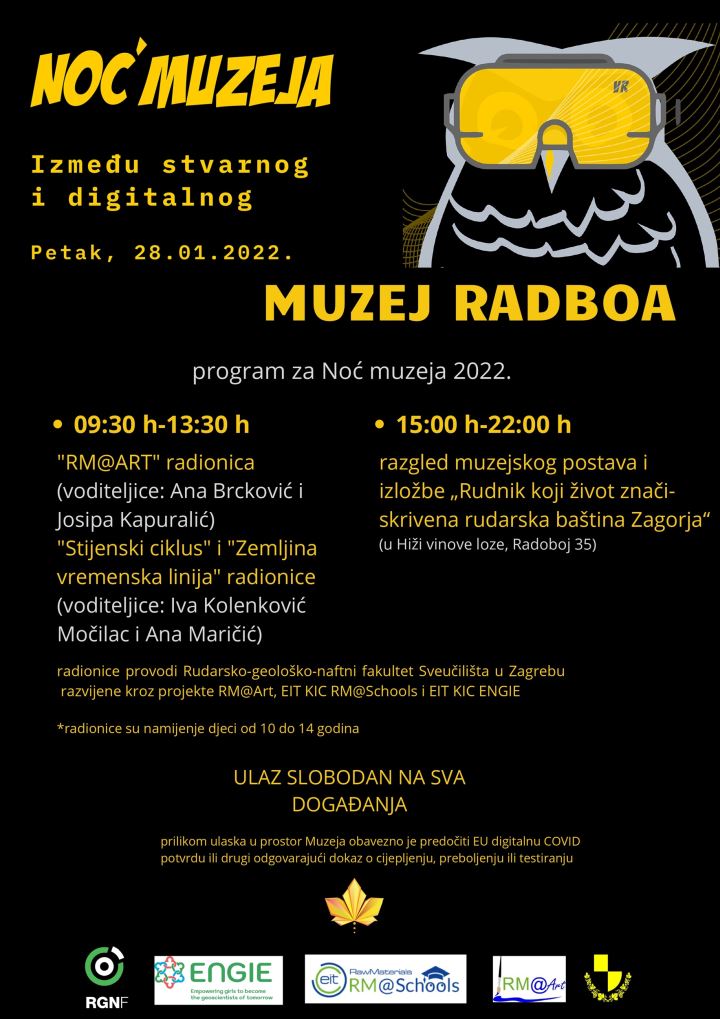 "Stijenski ciklus" i "Zemljina vremenska linija" (voditeljice: Iva Kolenković Močilac i Ana Maričić). Od 15:00 do 22:00 sata moći će se razgledati muzejski postav kao i izložba nastala u suradnji s Muzejem grada Pregrade Zlatko Dragutin Tudjina. Izložba pod nazivom „Rudnik koji život znači -skrivena rudarska baština Zagorja“ postavljena je u Hiži vinove loze, Radoboj 35, nasuprot Muzeja Radboa. Prilikom ulaska u prostor Muzeja i Hiže vinove loze obavezno je predočiti EU digitalnu COVID potvrdu ili drugi odgovarajući dokaz o cijepljenju, preboljenju ili testiranju.