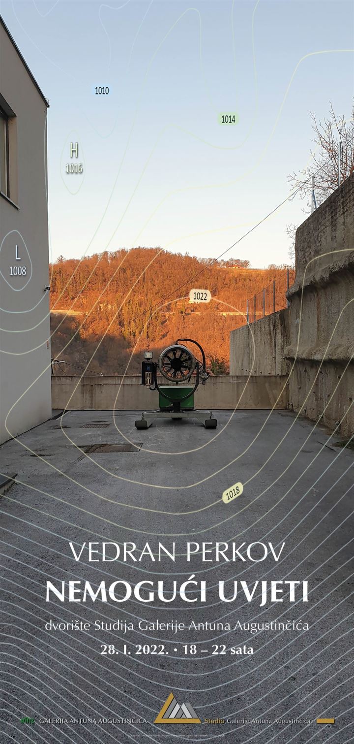 -„Stroj za proizvodnju umjetnog snijega stvara snježni zapuh u vanjskom prostoru Studija Galerije Antuna Augustinčića. Simulirana snježna oluja fingira silu prirode. Spektakl vremenske nepogode, sudara prirodnih elemenata, nemogućih vremenskih uvjeta umjetno je proizveden. Buka koju stroj generira dodatno naglašava artificijelnost situacije. Sve je lažno, i ne pokušavam to skriti- kaže Perkov.