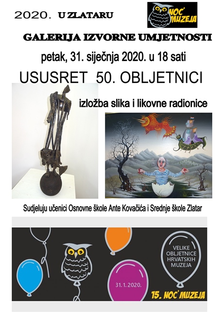 Galerija izvorne umjetnosti Zlatar i Grad Zlatar i ove će se godine uključiti u tradicionalnu manifestaciju Noć muzeja, koja će se održati u petak, 31. siječnja. U Zlataru središnje će događanje biti u Galeriji izvorne umjetnosti gdje će se održati izložba “Ususret 50. godina Galerije izvorne umjetnosti Zlatar”. Galerija je u Zlataru osnovana 1971. godine kada se za izložbeni prostor koristila barokna Keglevićeva kurija u centru Zlatara. Prva izložba svečano je otvorena 25. rujna 1971. godine pod nazivom „Slikari zagorskog kruga“ koju je postavio prof. Vladimir Maleković. Godine 1985. Galerija je iz stare kurije preseljena u novi prostor u Zagrebačku ulicu br. 3 u centru Zlatara, gdje se nalazi i danas.
