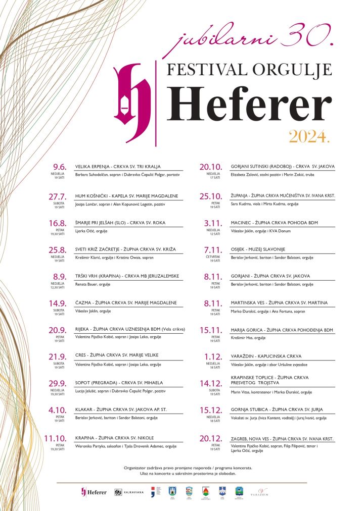Prvi koncert u sklopu Festivala već se održao u lipnju, no očekuje nas još preko 20 koncerata diljem Hrvatske. Donosimo vam program jubilarnog 30. Festivala Orgulje Heferer. Festival Orgulje Heferer, kojeg već 4. godinu za redom organizira udruga Kajkaviana zajedno sa Umjetničkom radionicom Heferer, nacionalni je festival na kojem mladi, ali i afirmirani hrvatski i inozemni orguljaši, uz svoje kolege vokalne i instrumentalne soliste, predstavljaju orguljsku baštinu Hrvatske. Koncerti se održavaju diljem Hrvatske u sakralnim objektima i reprezentativnim prostorima koji posjeduju orgulje koje je izradila, restaurirala ili održava Umjetnička radionica Heferer. Održavanje koncerata na obnovljenim, iznimno vrijednim, povijesnim instrumentima doprinosi njihovoj revitalizaciji te time i očuvanju kulturne baštine.