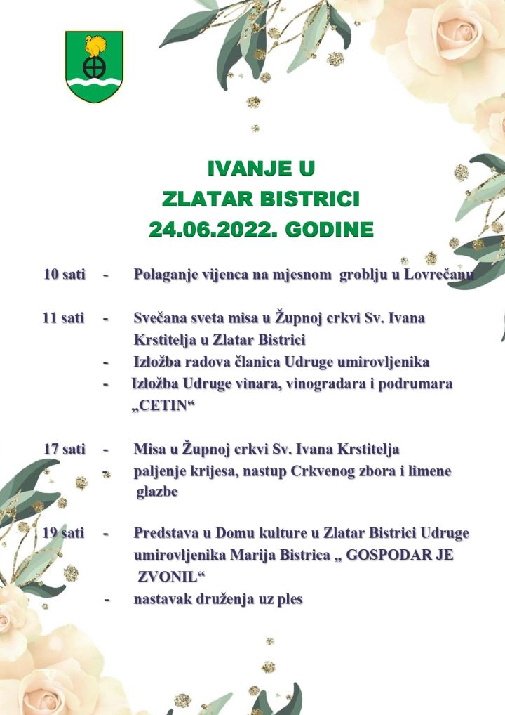 Općina Zlatar Bistrica poziva na proslavu Ivanja 24. lipnja. U 10 sati na mjesnom groblju u Lovrečanu bit će polaganje vijenaca, a u 11 sati svečana misa u župnoj crkvi sv. Ivana Krstitelja, uz izložbu radova članova Udruge umirovljenika i izložbu Udruge vinara, vinogradara i podrumara Cetina. U 17 sati na redu je ponovno misa te paljenje krijesa i nastup Crkvenog zbora i limene glazbe. U 19 sati u Domu kulture održat će se predstava Udruge umirovljenika Marija Bistrica Gospodar je zvonil te nastavak druženja uz ples.