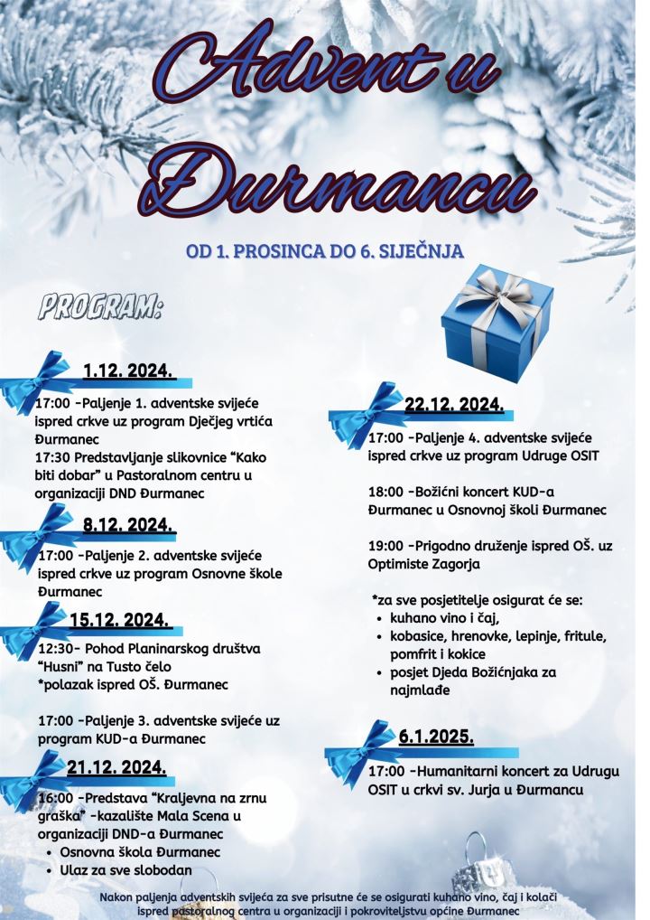 Adventska događanja završavaju 6. siječnja 2025. humanitarnim koncertom za Udrugu OSIT. Koncert će se održati u crkvi. Sv. Jurja u Đurmancu s početkom u 17 sati.