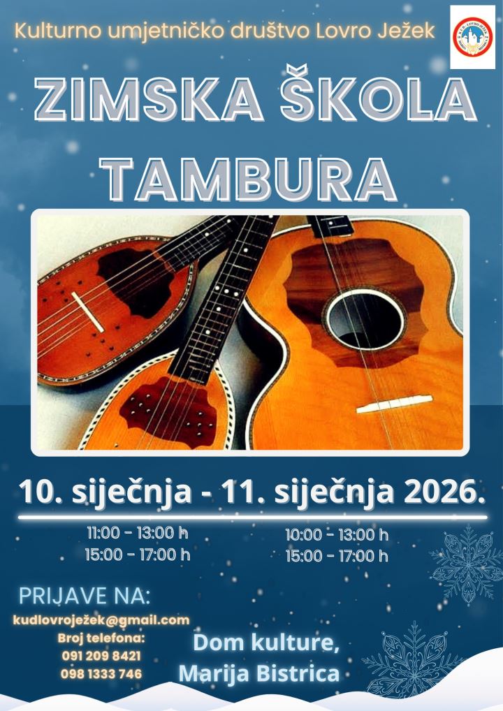 KUD ''Lovro Ježek'' Marija Bistrica organizira Zimsku školu tambura, koja će se održati ovoga vikenda u prostorijama KUD-a. Voditeljica će biti prof. mentorica Tatijana Lenart, koja i trenutno vodi mlađu tamburašku sekciju u KUD-u ''Lovro Ježek''. Termini ove dvodnevne škole su u subotu od 11 do 13 i od 15 do 17 sati, te u nedjelju od 10 do 13 i od 15 do 17 sati.