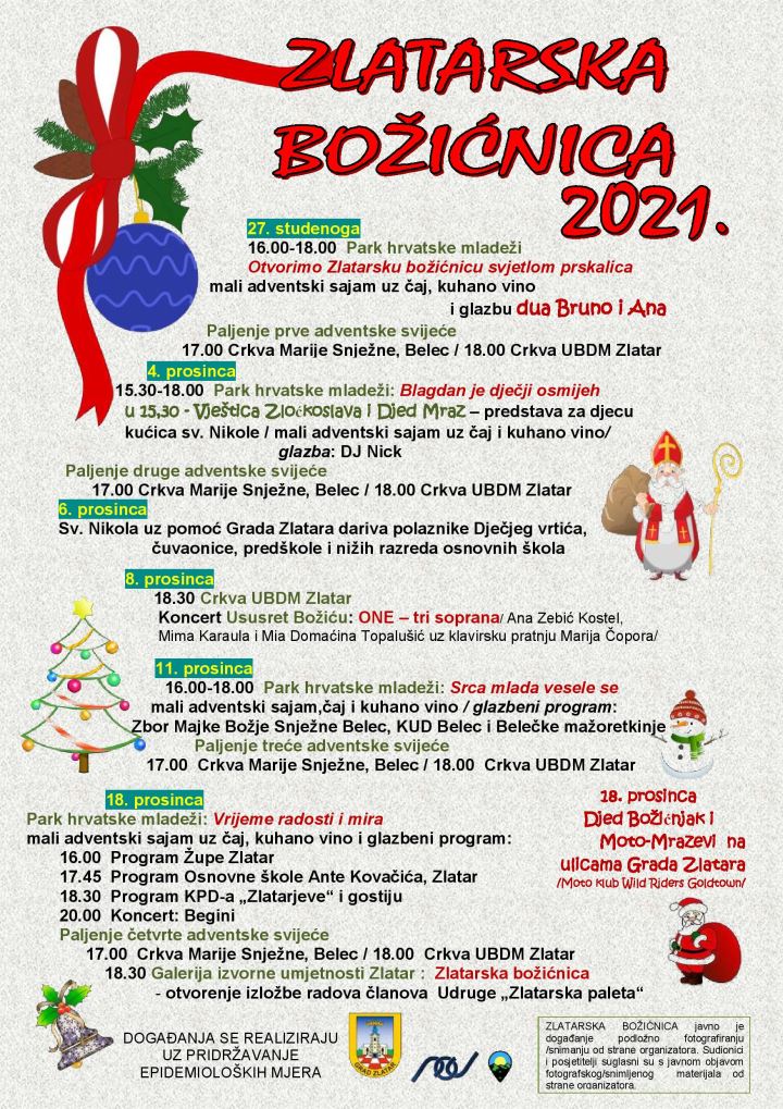 Uz pomoć Grada, 6. će prosinca Sv. Nikola darivati polaznike dječjeg vrtića, čuvaonice, predškole i učenike nižih razreda osnovnih škola, a 8. prosinca u 18. 30 sati u Crkvi UBDM u Zlataru na redu je koncert Usuret Božiću 'One – tri soprana' – Ana Zebić Kostel, Mima Karaula i Mia Domaćina Topalušić uz klavirsku pratnju Marija Čopora.