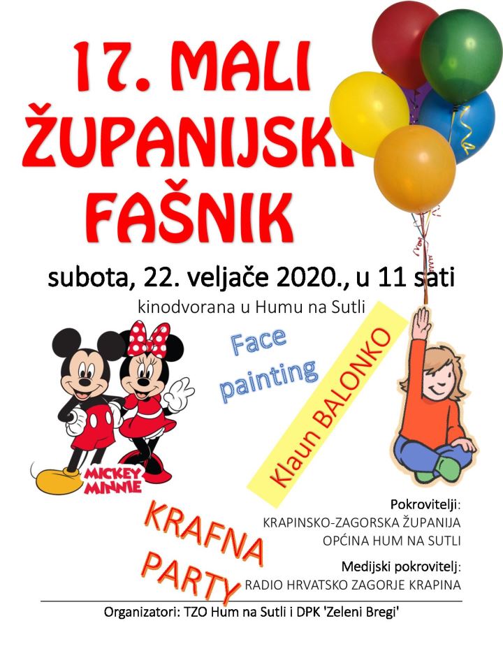Ove subote, 22. veljače u Humu na Sutli bit će održan 17. Mali županijski fašnik. Događanje organiziraju Turistička zajednica Općine Hum na Sutli i Destinacijsko – promidžbeni klub Zeleni bregi, pod pokroviteljstvom Krapinsko - zagorske županije i Općine Hum na Sutli. Za posjetitelje je pripremljen krafna party, oslikavanje lica i nastup klauna Balonka.